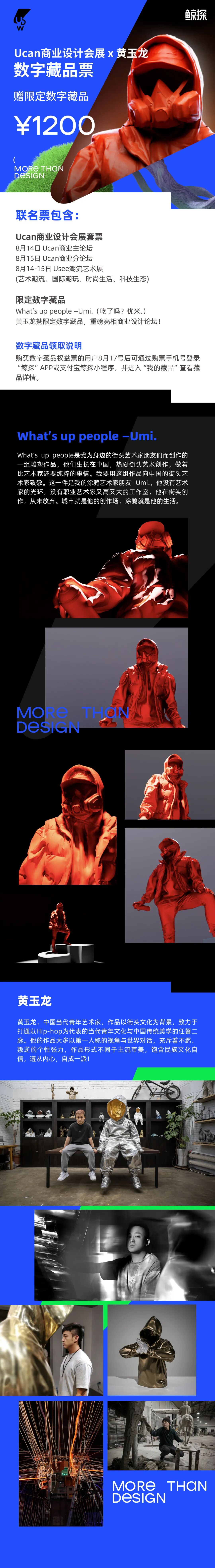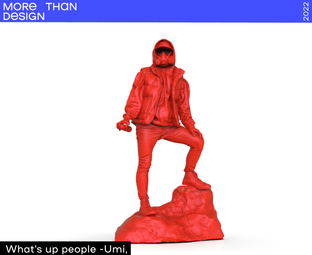 除了参与商业设计论坛,黄玉龙还为2022 U设计周打造了限定款数字藏品——《What's up people-Umi》,《What's up people-Umi》作品系列是黄玉龙雕塑创作的起点,每一个造型的《What's up people-Umi》都注入了他真情实感,记录和表达着他对生活的态度与思考。他重拾本土文化自信,将熟悉、热爱的Hiphop灵魂深入到创作中,他的创作理念和创作水准在卫衣人系列中得到了全面的展示。