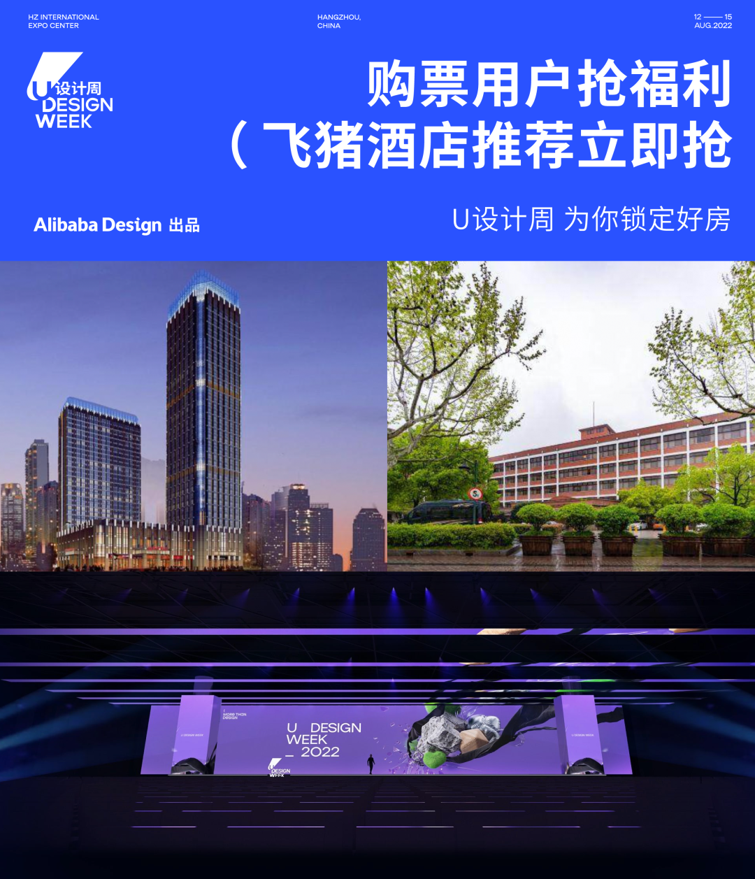 为了让大家看展方便舒适,U设计周联合飞猪旅行,特别为参展朋友们锁定了一批高性价比酒店,已购票的朋友可以享飞猪官方好房折扣+杭州政府消费券双重优惠!
