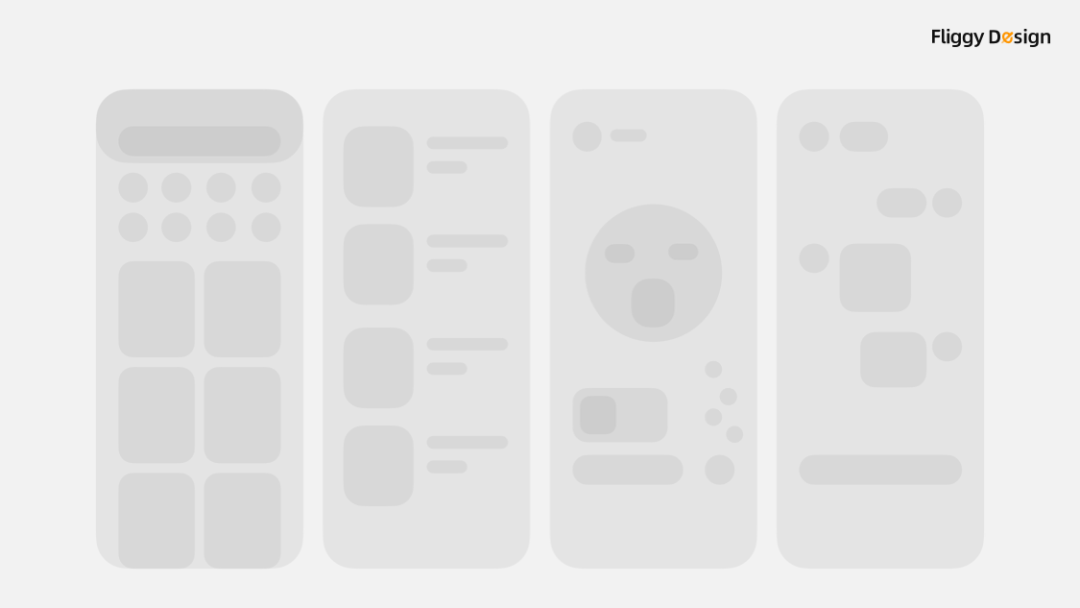 于是,我们做了一个简单的尝试:仅用几个圆角矩形去概括常见的界面,结果大家看到这些简单的框架,都能联想到对应类型的产品界面。