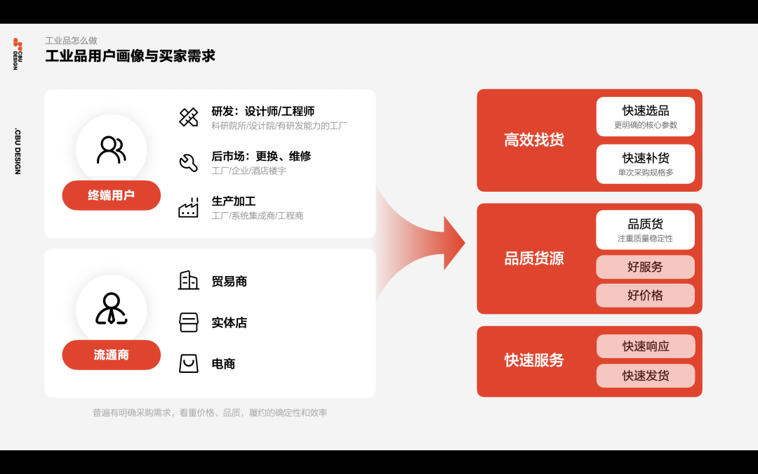 根据工业品买家采购的差异化需求和行为,从专业链路、专业内容这2个方向进行专业化设计。专业链路是指根据工业品买家找货特点,建设符合买家特点的找货链路;专业内容,是指根据工业买家选品心智,提供符合买家挑品决策需要的商品信息内容。