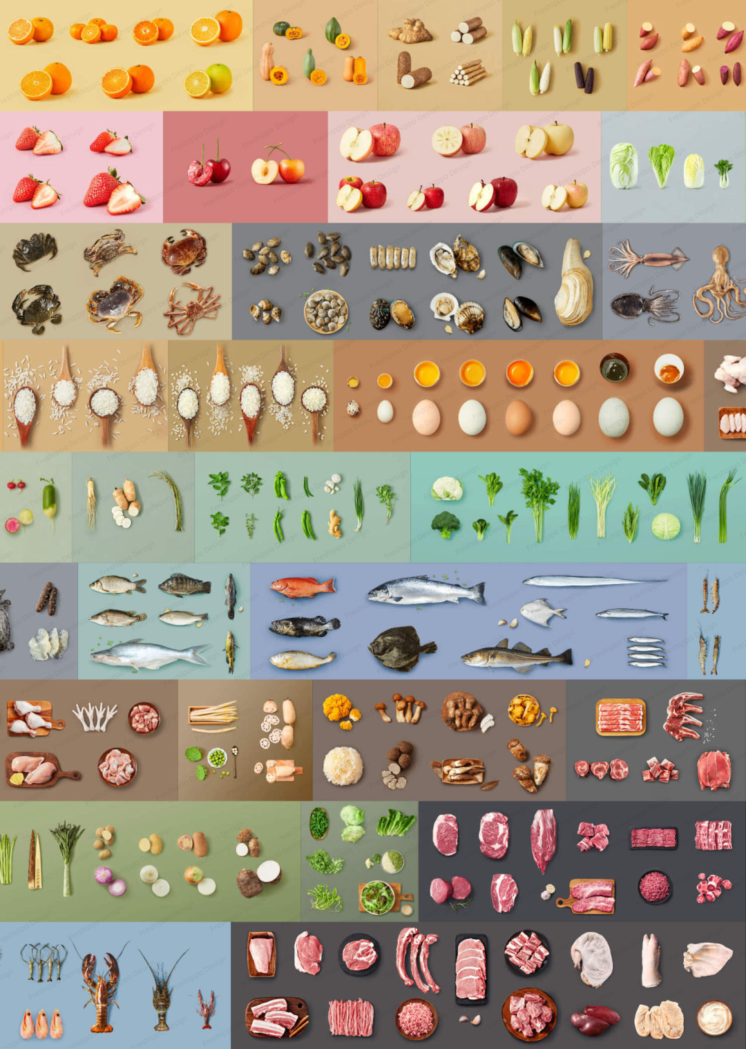 刚开始我们是基于牛肉这个食材做身体部位的解剖图,去传达专业度,但是具体落地和实践发现这种个性化布局不能做到结构化自动化生产,同时在食材图谱展示中很难做到可交互的感知,最终确认使用图谱这种规律化的排列,拍摄采用了俯视全景低拍视角结合同品类的色彩打底进行品质感设计;标题栏会传达食材百科的logo心智,顶部做二级类目的滑动筛选,图谱和四级tab都可以进行点击切换,底部对应展示食材的知识和做法feeds流;我们希望给到用户这些食材的知识点内容可以辅助用户快速决策他今天到底吃什么,定制出盒马食材的专属吃法;