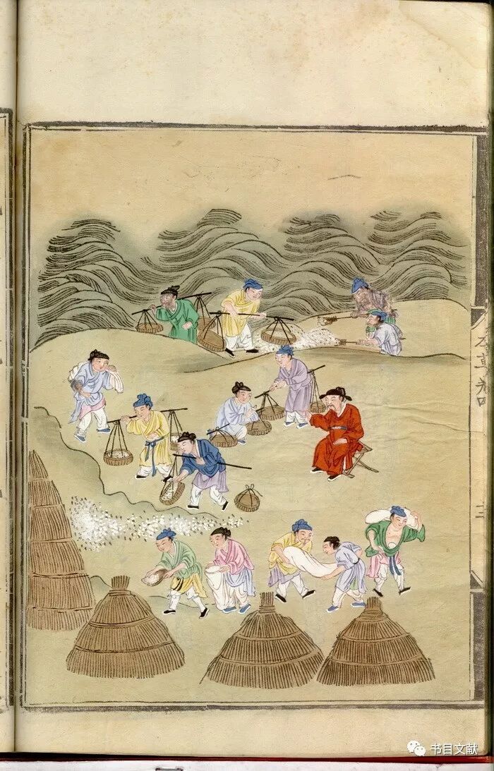 上海图书馆所藏的万历十五年(1587)内府刻本《重修政和经史证类备用本草》,是另外一部具有典型宫廷版画色彩的、图文并茂的图书。该书共30卷,收载药物1700余种,每种药物均配有一幅插图,图书本身为雕版印刷,但是书中插图却进行了纸本设色,由于使用的均为彩色矿物质颜料,故该书插图部分色彩艳丽、触手如新。其风格大致与国家图书馆所藏明内府彩绘本《明解增和千家诗注》相类。(插图12)