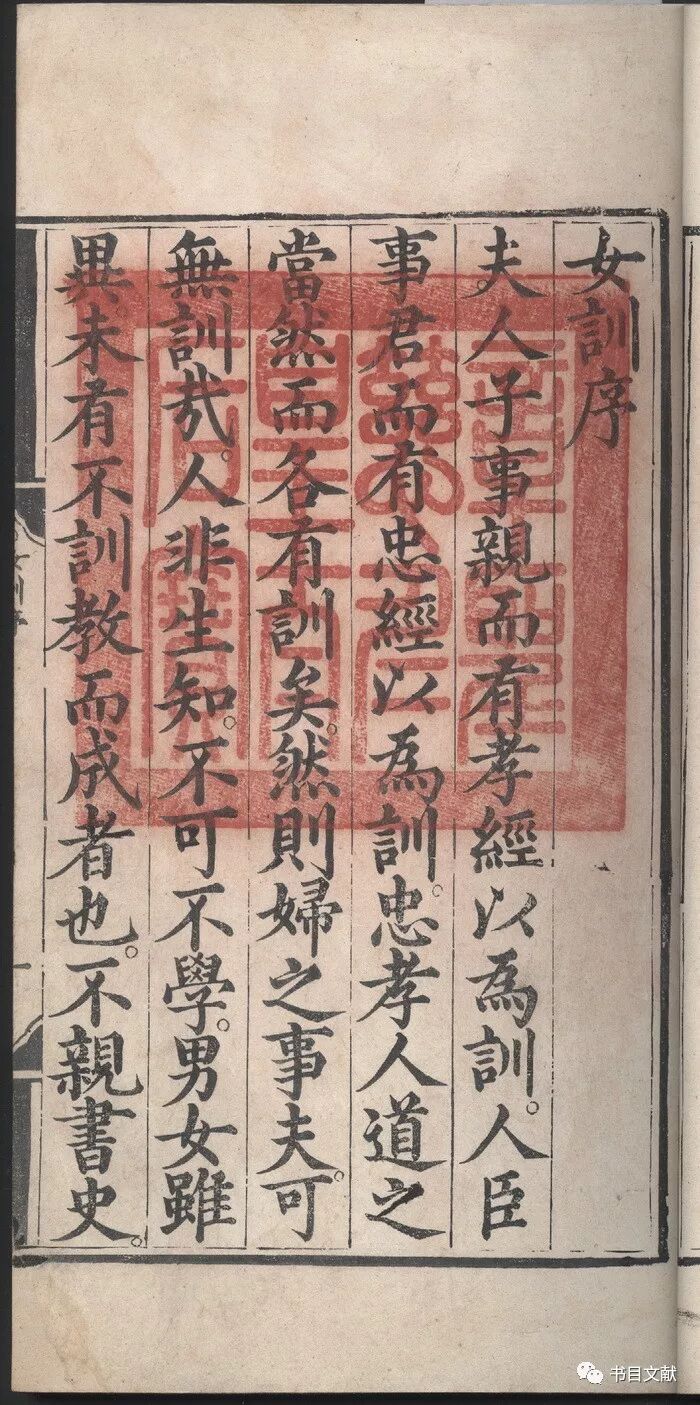 “章圣慈仁皇太后宝”即钤于蒋氏《女训序》序首,该宝为阳文方印,印面极为阔大,高达14.4厘米,宽达14.3厘米,仅次于前面所述“钦文之玺”,几乎占据了该书整个半叶宽度;印文小篆,分四行排列;边框粗重。