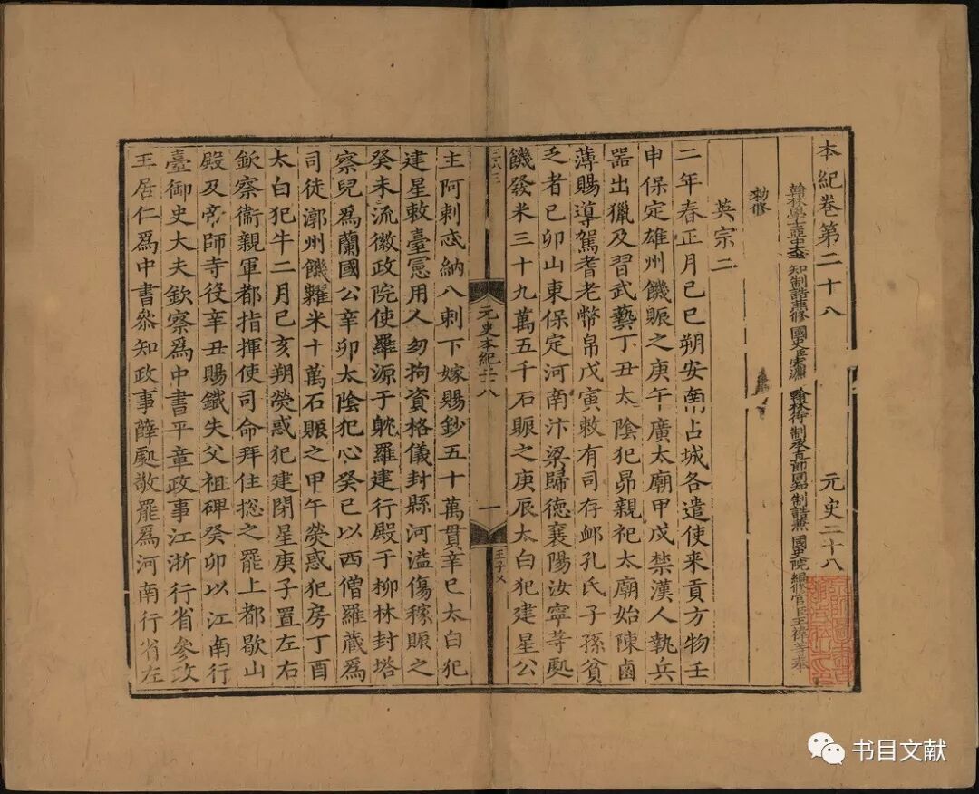 黄永年先生也注意到明代内侍太监掌权是一个逐渐发展的过程,认为“成祖兴师夺取帝位……以后才有内府本由司礼监刊刻、下属经厂库存储书版并印行之事。”[8]所以黄先生认为:洪武年间在南京刊刻的《元史》(插图1)、《回回历法》、《华夷译语》、《大明集礼》、《大明律》、《大诰》、《大诰续编》、《大诰三编》、《大诰武臣》、《孟子节文》等书籍和宦官没有关系,只能称为“内府本”,而不能称为“经厂本”。