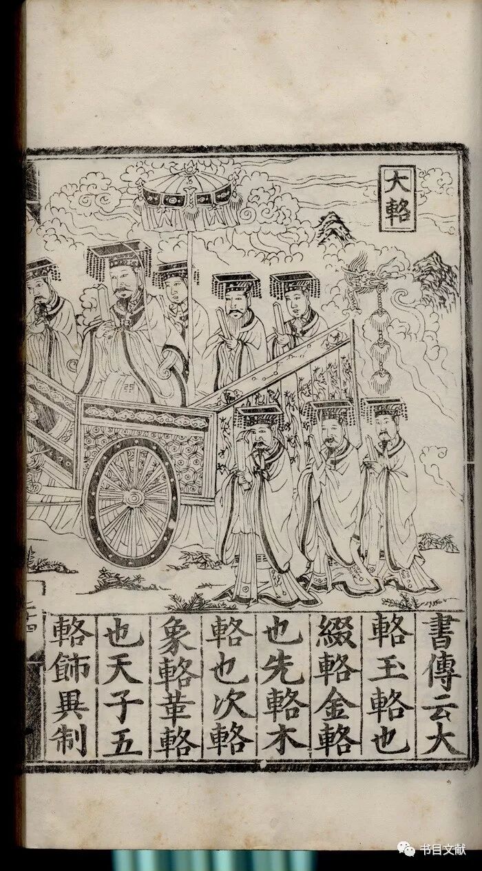以该书中的“大辂”图为例(见图11),这幅图占据了整个一叶的百分之八十,图画正中为一架驷马骈驾的玉辂,皇帝端坐其中,左边有执笏随臣三名,右边执笏随臣四名,车前引导侍从一名,各人俱戴冠冕;四匹马或昂首向前,或奋蹄用力,各具神态,鞍辔上绣有云纹图案;玉辂上的龙头车辕、车轮辐辏、车厢上的云纹浮雕皆清晰可见。