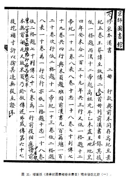 繆荃孫《清學部圖書館善本書目》一書,主要是根據曹元忠《文華殿檢書分檔》、姚覲元《咫進齋善本書目》、瞿鏞《鐵琴銅劍樓藏書目錄》三種書目改編而成,造成此目體例不一的原因也在此:因利用曹稿,故目中有書志詳考之例;因沿用姚目,故留下了過錄藏書題跋的體例。[39]《清學部圖書館善本書目》爲私家藏目向圖書館公藏書目過渡之產物,繆氏利用舊目合編,加以統稿,又加上了著錄上的新規範。