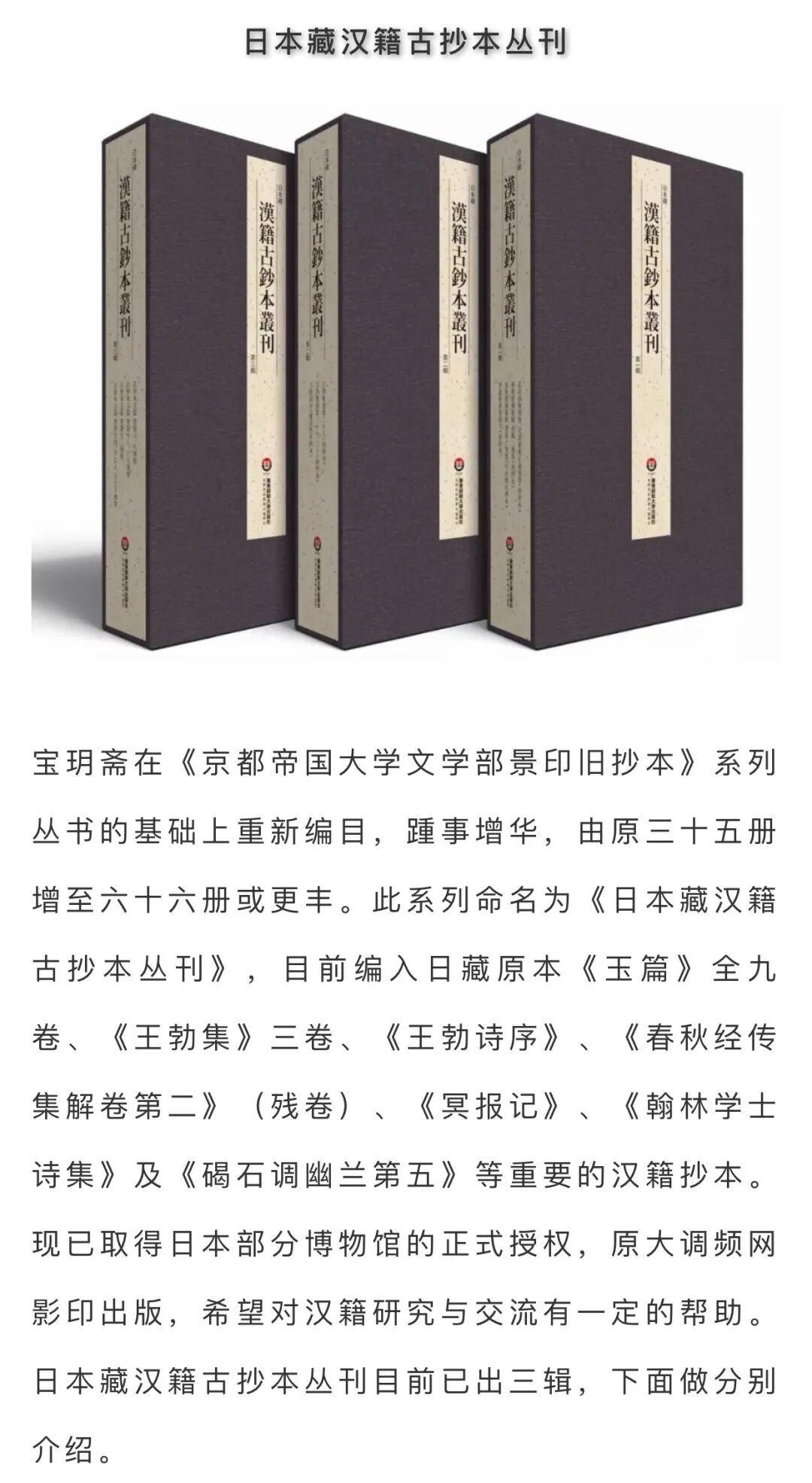 《日本藏汉籍古抄本丛刊》是在《京都帝国大学文学部景印旧抄本》系列丛书的基础上重新编目,踵事增华,由原三十五册增至六十六册或更丰。目前编入日藏原本《玉篇》全九卷、《王勃集》三卷、《王勃诗序》、《春秋经传集解卷第二》(残卷)、《冥报记》、《翰林学士诗集》及《碣石调幽兰第五》等重要的汉籍抄本。现已取得日本部分博物馆的正式授权,原大调频网影印出版,希望对汉籍研究与交流有一定的帮助。