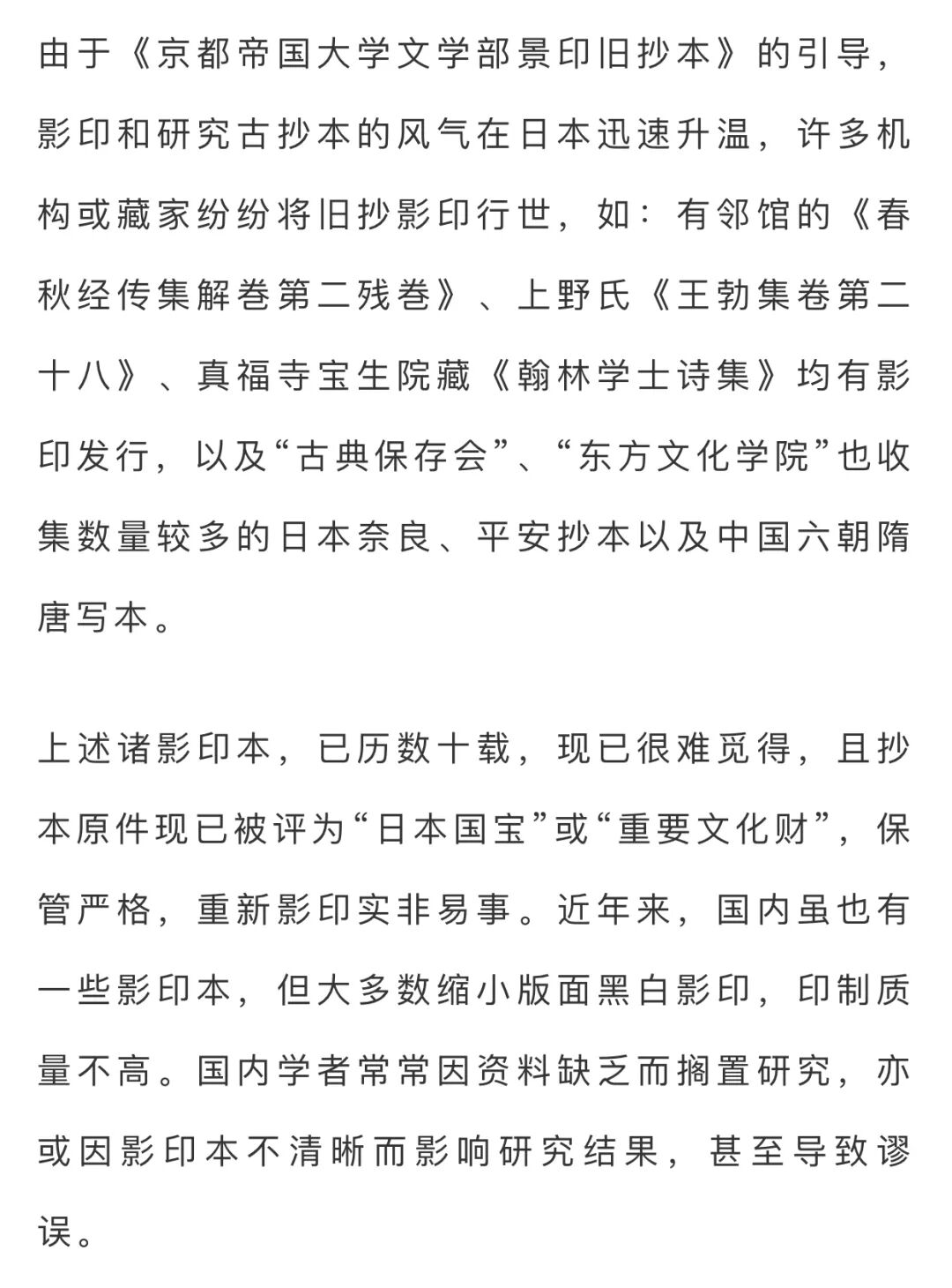 黎庶昌本据传写本刊刻,又经校勘改动,已非写卷本来面貌。罗振玉影本虽较真实保存写卷原貌,但当时印量甚少,现已难觅。中华书局本常见,但其多据黎庶昌本,缺陷与黎本同。《续修四库全书》本所据底本甚善,惜其字迹不甚清晰,至有些地方无法辨识。本次以调频网精印,字大行疏,洵学林之美事!