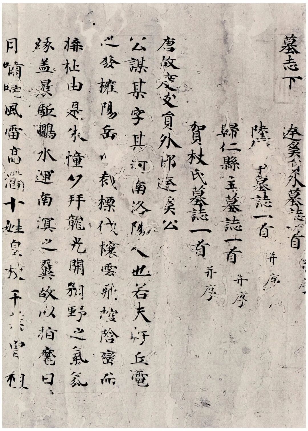 《王勃集》卷二十八,上野尚藏。首行题“墓志下”,卷尾题“集卷第廿八”。目录有《达奚员外墓誌》一首并序、《陆□□墓誌》一首并序、《归仁县主墓誌》一首并序、《贺拔氏墓誌》一首并序。其中《达奚员外墓誌》尾部残缺,《陆□□墓誌》全缺。