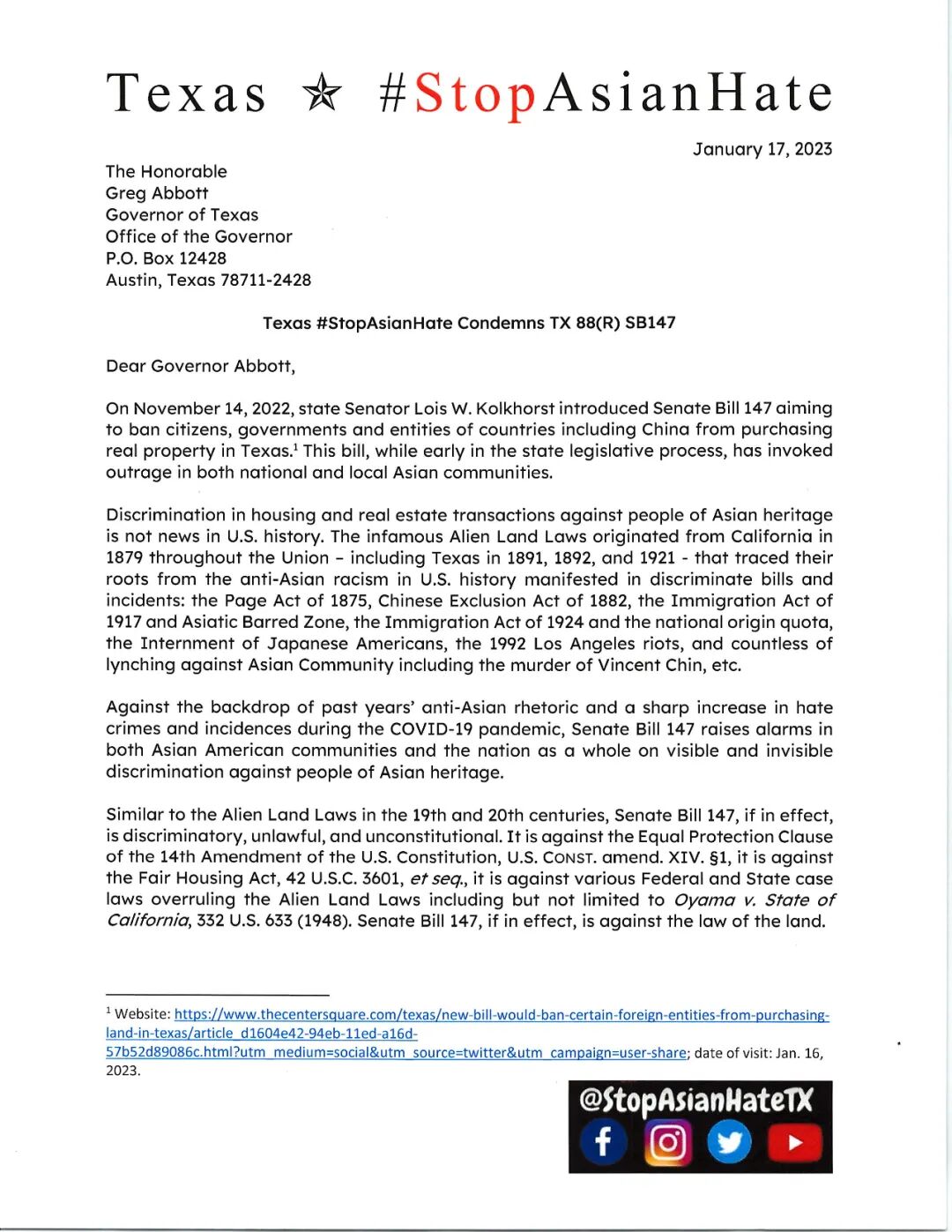 [Recipient Address] [Date] RE: Texas #StopAsianHate Condemns TX 88(R) SB147 Dear [Recipient ], On November 14, 2022, state Senator Lois W. Kolkhorst introduced Senate Bill 147 aiming to ban citizens, governments and entities of countries including China from purchasing real property in Texas.[1] This bill, while early in the state legislative process, has invoked outrage in both national and local Asian communities. Discrimination in housing and real estate transactions against people of Asian heritage is not news in U.S. history. The infamous Alien Land Laws originated from California in 1879 throughout the Union – including Texas in 1891, 1892, and 1921 - that traced their roots from the anti-Asian racism in U.S. history manifested in discriminate bills and incidents: the Page Act of 1875, Chinese Exclusion Act of 1882, the Immigration Act of 1917 and Asiatic Barred Zone, the Immigration Act of 1924 and the national origin quota, the Internment of Japanese Americans, the 1992 Los Angeles riots, and countless of lynching against Asian Community including the murder of Vincent Chin, etc. Against the backdrop of past years’ anti-Asian rhetoric and a sharp increase in hate crimes and incidences during the COVID-19 pandemic, Senate Bill 147 raises alarms in both Asian American communities and the nation as a whole on visible and invisible discrimination against people of Asian heritage. Similar to the Alien Land Laws in the 19th and 20th centuries, Senate Bill 147, if in effect, is discriminatory, unlawful, and unconstitutional. It is against the Equal Protection Clause of the 14th Amendment of the U.S. Constitution, U.S. Const. amend. XIV. §1, it is against the Fair Housing Act, 42 U.S.C. 3601, et seq., it is against various Federal and State case laws overruling the Alien Land Laws including but not limited toOyama v. State of California, 332 U.S. 633 (1948). Senate Bill 147, if in effect, is against the law of the land. We call on the Texas Legislature not to pass Senate Bill 147 and to censure state Senator Kolkhorst. We also call on Governor Abbott to veto the bill should it pass the state legislature. Yours sincerely, /Signature/ [1]Website: https://www.thecentersquare.com/texas/new-bill-would-ban-certain-foreign-entities-from-purchasing-land-in-texas/article_d1604e42-94eb-11ed-a16d-57b52d89086c.html?utm_medium=social&utm_source=twitter&utm_campaign=user-share; date of visit: Jan. 16, 2023.