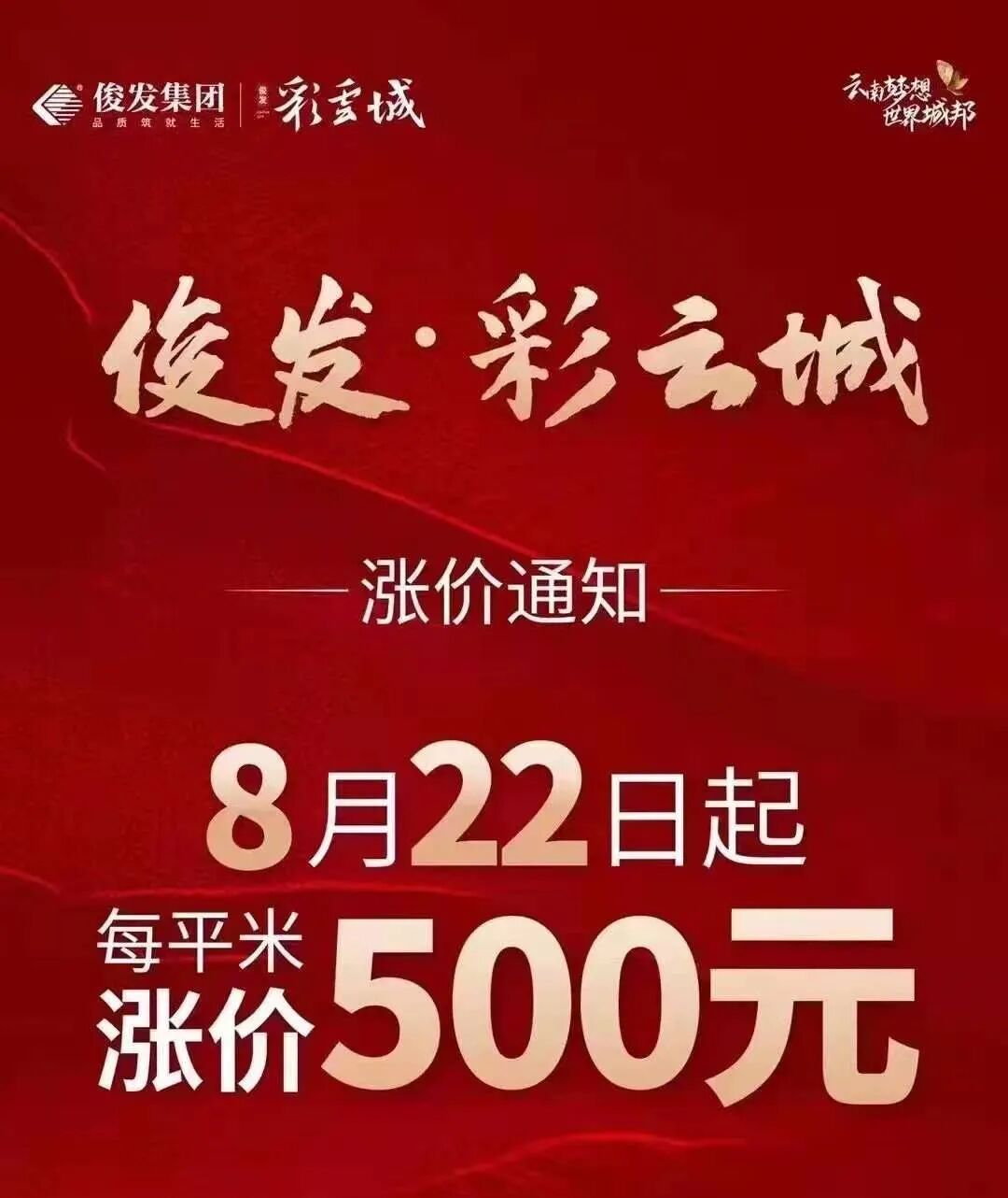 俊发彩云城涨价公告(来源朋友圈)