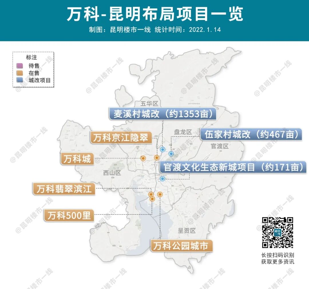 此外,招商蛇口与昆钢合作的昆钢轧钢厂改造项目拆迁工作已提上日程,该项目位于凉亭片区,地段优秀,开发后东市区将再迎一新盘。2021年,万科以84.59亿元销售金额,在昆明房企中排名第3,成绩优异。万科在售项目分布在昆明北京路沿线、滇池会展片区、巫家坝、西北新城等热门板块。其中,万科城、万科公园城市等一直是板块内热销大盘,信达万科京江隐翠去年11月开盘后,也成为北京路上的标杆之作。去年11月,万科参与的麦溪村城改已启动拆迁,作为龙泉路最大城中村,项目占地约1353亩,对万科补充土储的意义不一般。