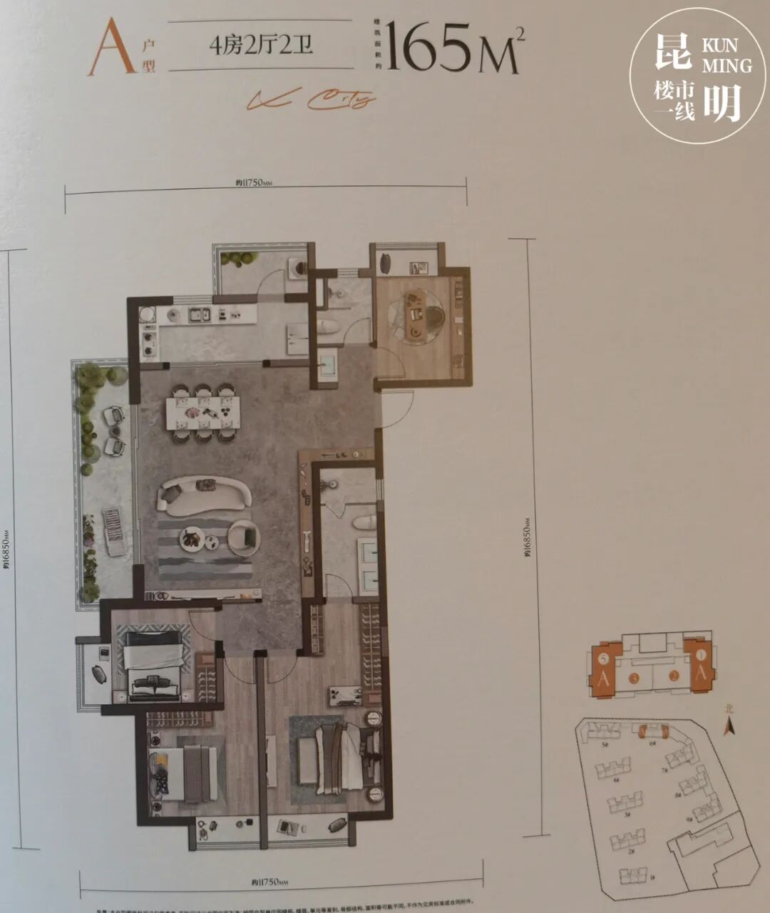 据了解,项目计划首推5、6号楼,吹风1.6-2.1万/平,精装交付。首推户型在108-165平,共设计有5个,覆盖3房到4房。这一户型为南朝向,餐客竖厅设计,观景阳台连接客厅与次卧。该户型为2梯6户设计,公卫和厨房通过连廊采光,采光一定程度会受限。这一户型格局方正,同样带双阳台。不过,次卧和厨房外有一个生活阳台,只能靠二次采光。项目约135平样板间(昆明楼市一线摄)