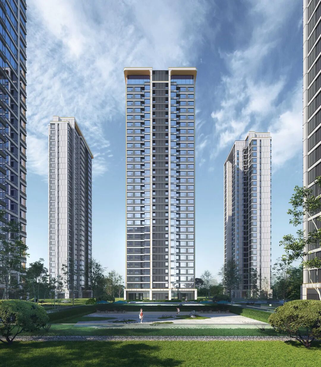 社区内部共规划有约1.3万㎡双中庭园林景观,南中庭以水景为主,北中庭则在景观中央设置一大片阳光草坪。为业主留出专属户外空间,舒适度满分,也颇有一番意境。