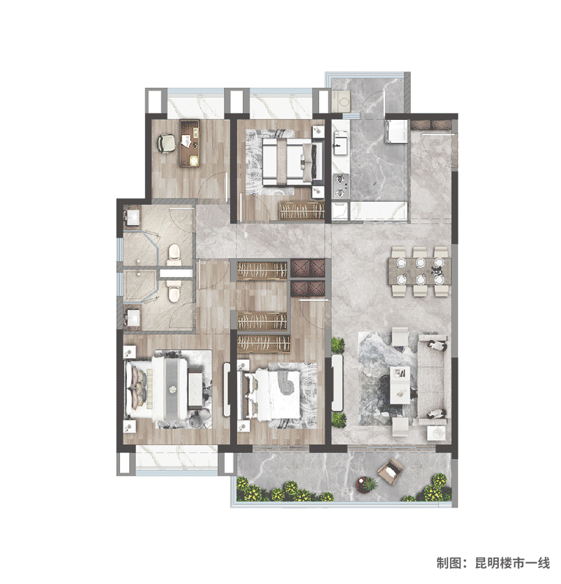 进入示范区之前,这里给人的第一印象就是颜值很高,气场铺垫很到位。大面积开阔水景,远超一般项目的手笔。它不仅让建筑倒映水中,也让“昆明蓝”在眼前铺开。就算什么都不做,在这里坐一个下午,心情也极度舒适。水景惊艳,但也只是“开胃前菜”。想解锁更多精彩,还要再往里走。一路上,你能看到的水石、花木和建筑,表面上不显山不露水,但其实来头都不小。这次,华发从全国各地精心挑选了不少绿植及用材,比如来自广州的罗汉松、广西的桂花树、安徽的乌桕、福建的中庭垒石头…这样一幅美景,不仅有昆明之美,更集合全国各地的精粹。![]()