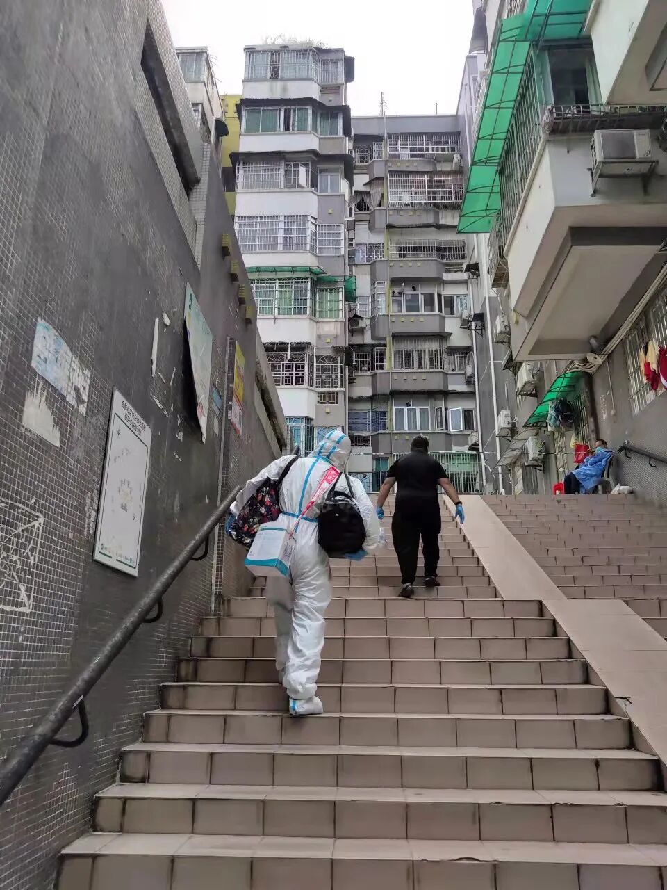 10月31日中午黄女士带着可供孩子食用多日的母乳来到封控区卡口,与工作人员交接,昌岗街志愿者松哥、南洲街志愿者友维第一时间取物后,小心翼翼地运送至所在的楼梯口,由负责该栋的海幢街志愿者智毅和阿禹送上该房交接给黄女士家人,由于两大袋母乳需要冰袋保鲜,异常沉重,穿上大白防护衣的志愿者智毅负重爬楼前行的背影让人深深感动。