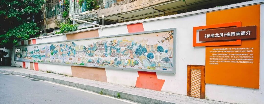 瓷砖画《锦绣龙凤》位于新民大街,为了致敬和借鉴1992年创作的瓷砖宣传画《二龙古街沐春风》,它将龙凤街现时的街道全貌描绘出来,呈现龙凤街新风貌和欣欣向荣的景象,增强居民群众的认同感和归属感。
