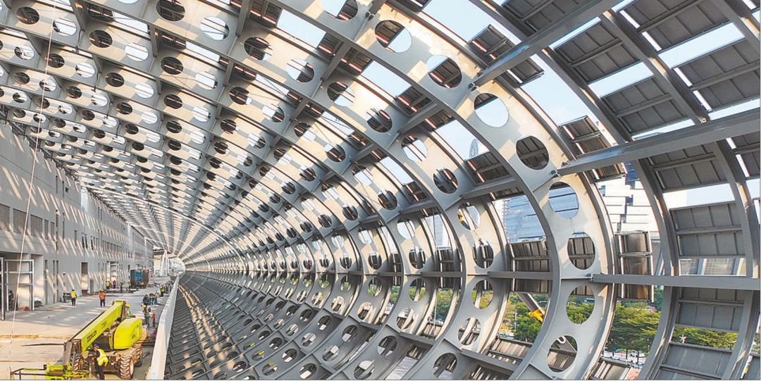 近日,位于海珠区的广交会展馆四期项目现场,建设者正在加紧施工,现场一派繁忙景象。目前项目建设全面进入收官阶段。