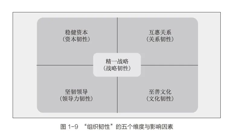 我发现组织韧性不是一项单一的能力,而是一个能力组合。高韧性企业的韧性组合包括战略韧性、资本韧性、关系韧性、领导力韧性和文化韧性。相应地,我发现高韧性企业每一项韧性能力的背后都有一个显著的驱动因素。“精一战略”塑造了战略韧性,“稳健资本”塑造了资本韧性,“互惠关系”塑造了关系韧性,“坚韧领导”塑造了领导力韧性,“至善文化”塑造了文化韧性(图1-9)。