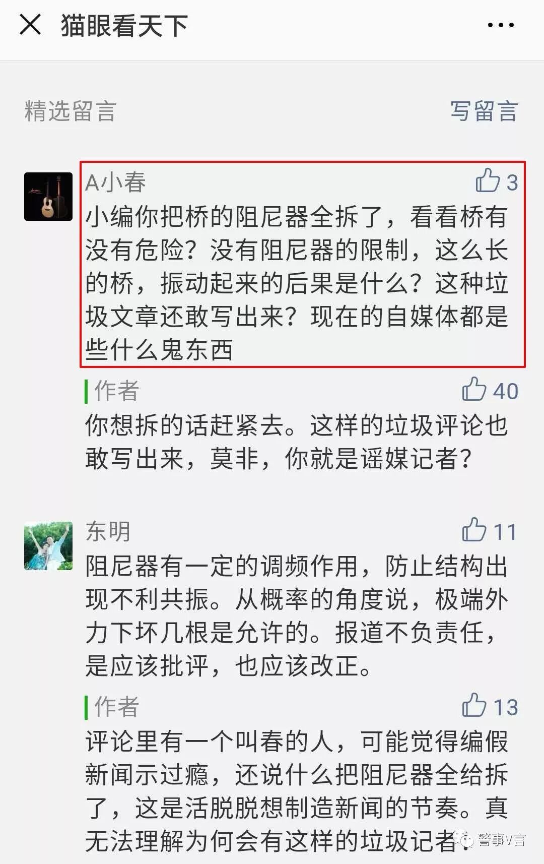 这是微信公众号猫眼看天下(ID:cat-discuss)留言区的一条来自于网民A小春的评论,TA蛮横无理地狡辩,并将所有的自媒体扣上了鬼东西这样的蔑称,真不知道这种自高自大的心态从何而来?还有一位网民NT徐旭东在南通网警辟谣帖下留言:建议不要轻易用“谣言”二字,准确表述应该是信息不准确。这就是一种标准的玩弄文字游戏的伎俩,既然你如此谨慎,为何面对故意将阻尼器滑落与斜拉索断裂两个性质根本不同的新闻表述,为什么你不肯提出“”建议不要轻易用“”断裂二字,准确表述应该是阻尼器滑落“这样的评论呢?