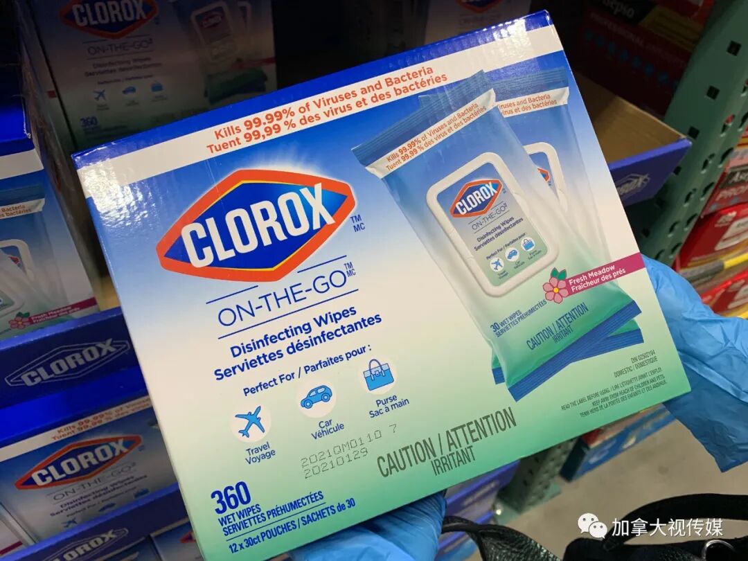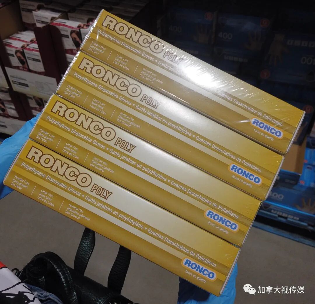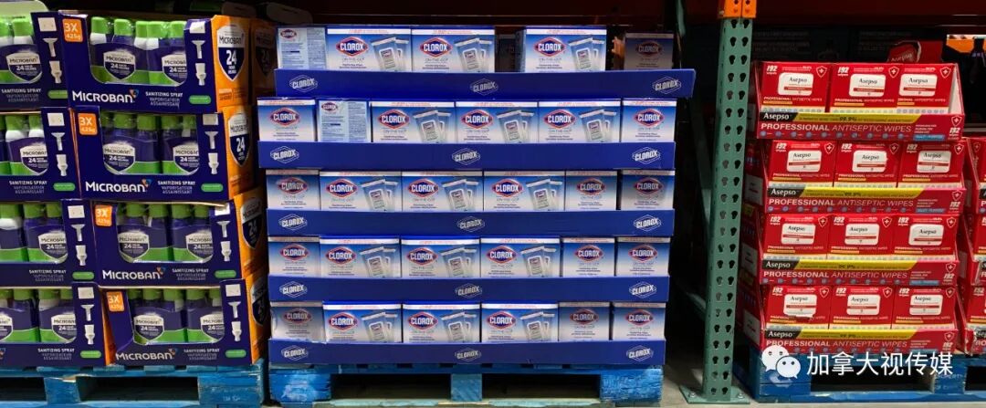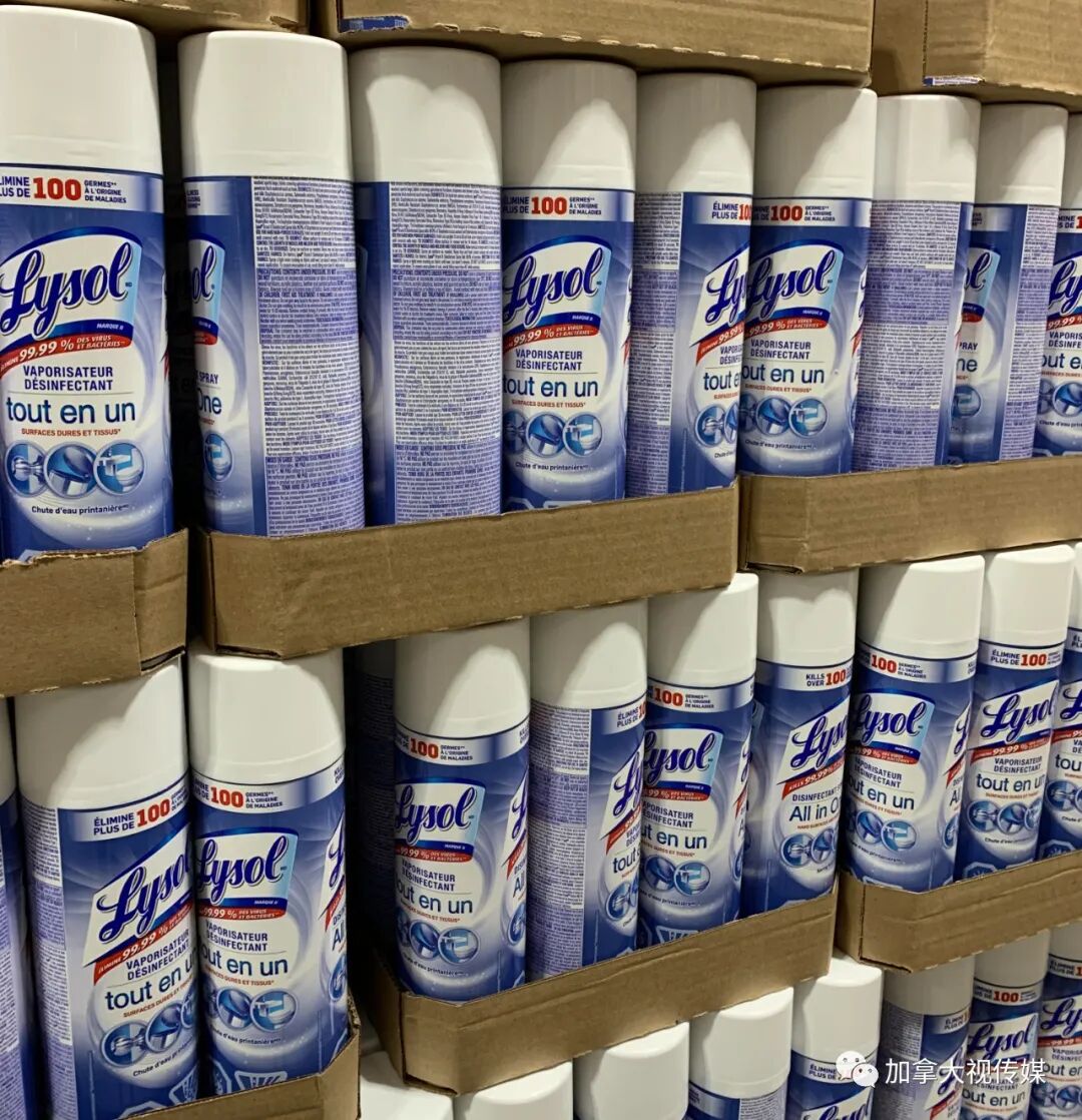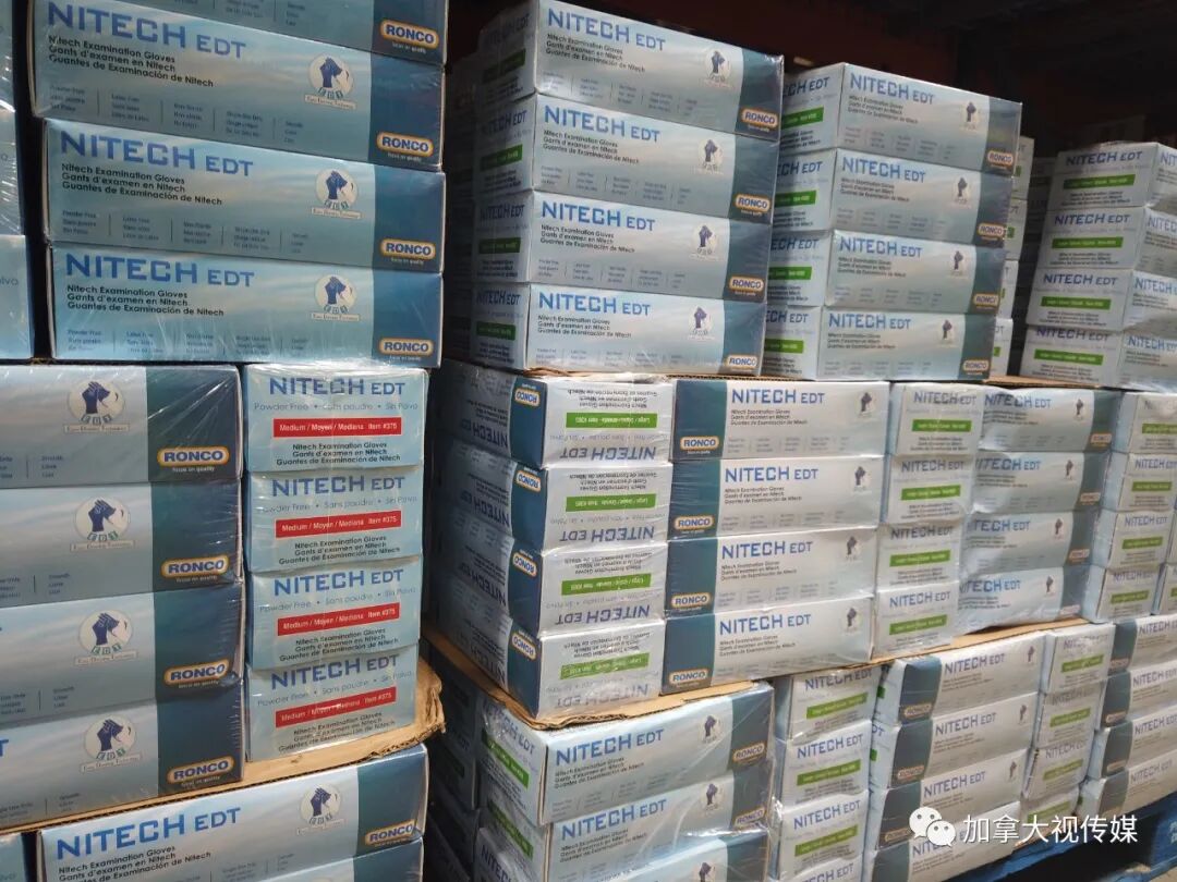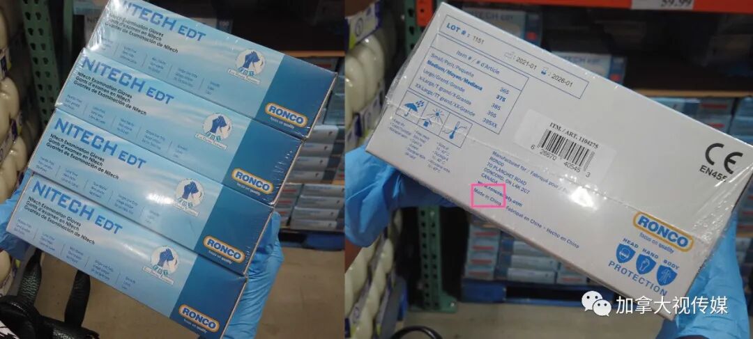 不只口罩,加拿大市场上诸如一次性手套、消毒喷雾、消毒湿纸巾等重要防疫用品,也都是“中国造”。