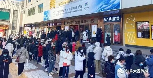 冬奥特许商店门前排起了长龙,全球各地人士竞相购买冬奥吉祥物“冰墩墩”。