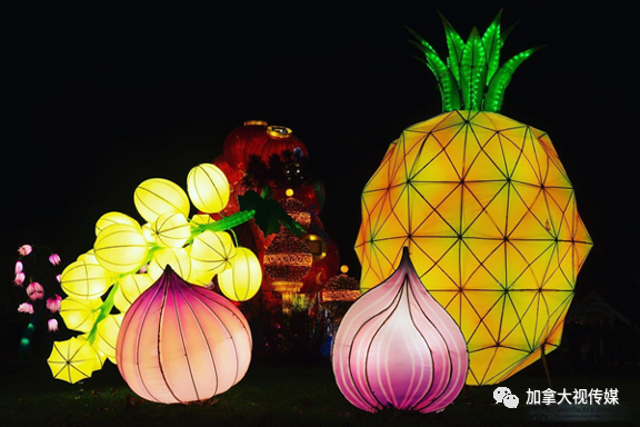 灯展的第一个小主题是食物。菠萝、洋葱等各类蔬菜瓜果横七竖八地躺满一地。