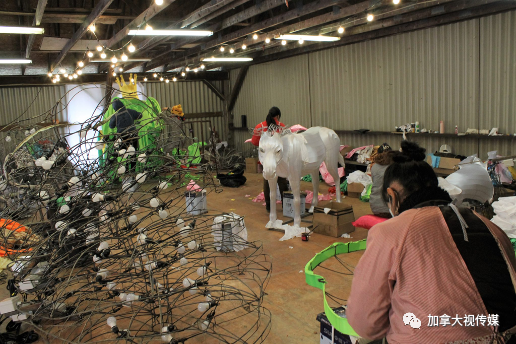 经过了彩扎、裱糊、编结、刺绣、雕刻等多道工序,再配以剪纸、书画等装饰制作而成,最后装灯、布线,按照设计进行喷绘。所有流程都是在加拿大当地完成。