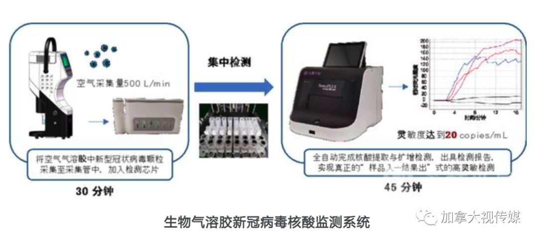 气溶胶采集器的空气流量达到400升/分钟,可在半小时内采集12立方米内的气溶胶颗粒并采集到病毒灭活液中,病毒富集效率为国内同类产品最高;一体化高灵敏新冠病毒核酸检测仪可实现自动化和全封闭式的新冠检测,全流程分析时间小于45分钟。