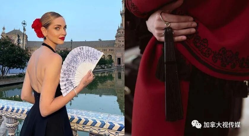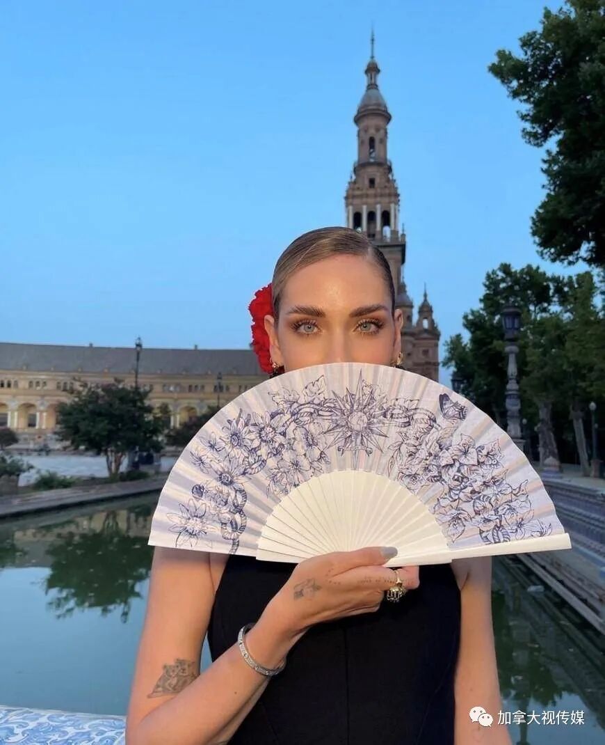 意大利时尚博主Chiara Ferragni社交媒体上,可见她拿了一纸摺扇摆起Pose拍美照,扇子上的图案是这次秀上服装大量出现的印花图腾