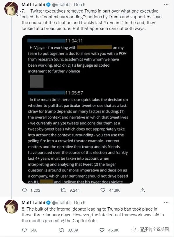 “(8). 1/6到1/8这三天,推特内部进行了大辩论,最终决定封禁特朗普。”