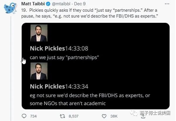 “(19). Pickles 很快回答说是否可以“只说‘合作关系’”。停顿了一会儿之后,他说:“例如,我们不确定是否会将 FBI/DHS(国土安全部) 描述为专家。”