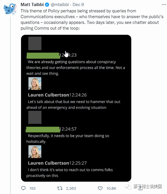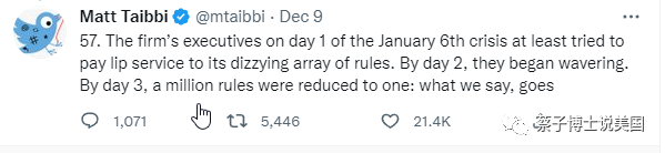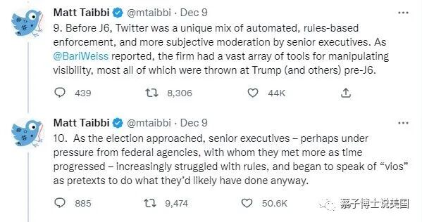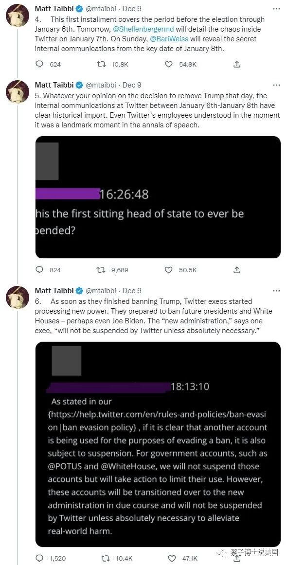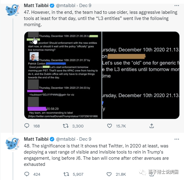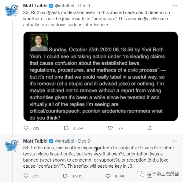 “(3). 我将给大家展示一些从未被公开的资料:1月6日之前推特内部规则的腐蚀; 公司高层违背了他们自己制定的规则; 以及跟联邦机构的互动文件。