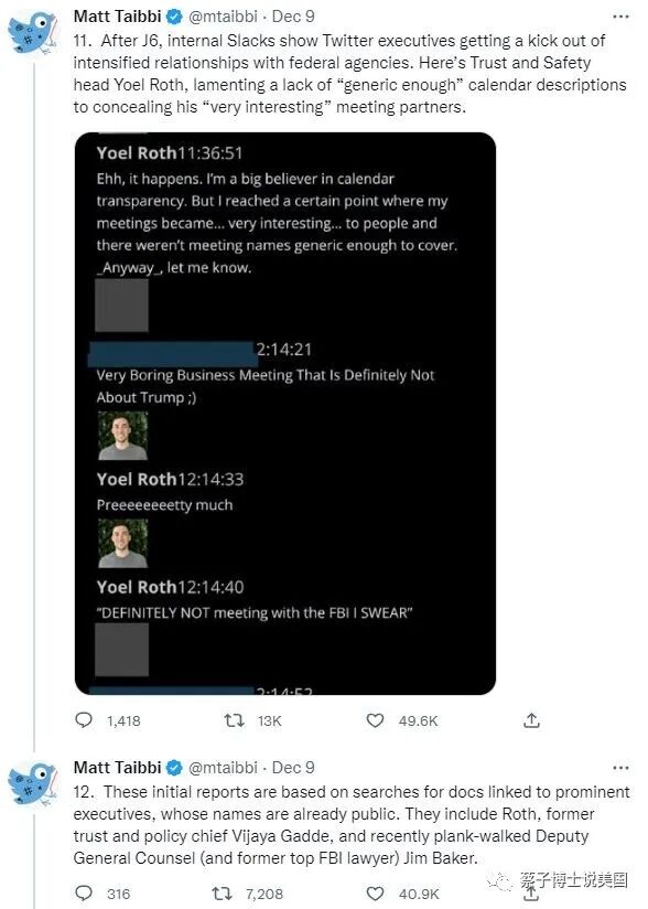 “(11). 在1月6日之后,Twitter 的内部 Slacks (一个公司内部使用的聊天工具) 显示推特高管从与联邦机构加强关系中获得乐趣。这里是“信任和安全”负责人 Yoel Roth,感叹缺少足够“通用”的日历描述来隐藏他的“非常有趣”的会议伙伴。”