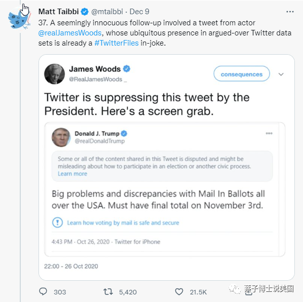 “(37). 看似无关紧要的后续涉及演员@realJamesWoods的推文,他在争论不休的Twitter数据集中无处不在,已成为#TwitterFiles内部笑话。”