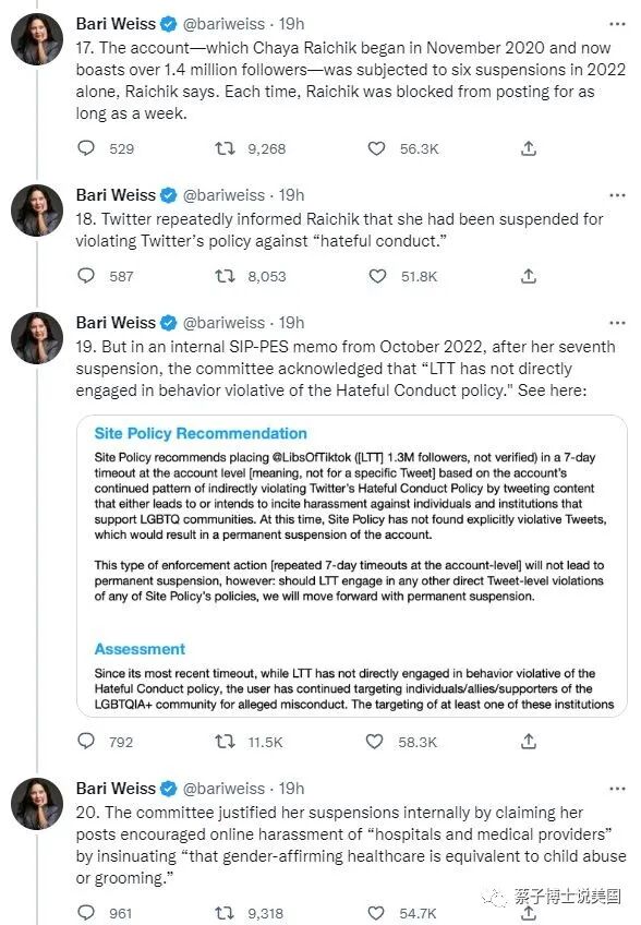 “(19). 但是在她被第七次封禁之后,SIP-PES 部门2022年10月份的一份内部备忘录承认Libs of Tiktok没有违反仇恨言论的政策”