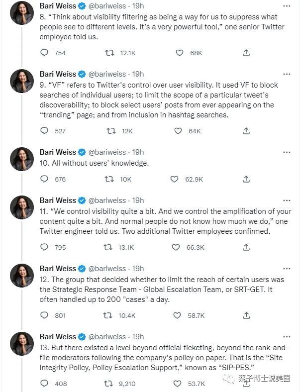 (1)这次爆料基本展示了推特是如何进行限流,加黑,封号等等操作的。并且他们对外从不承认干了这些事。他们跟这些见不得人的勾当起了很迷惑性的名字,例如“可见度过滤”等等