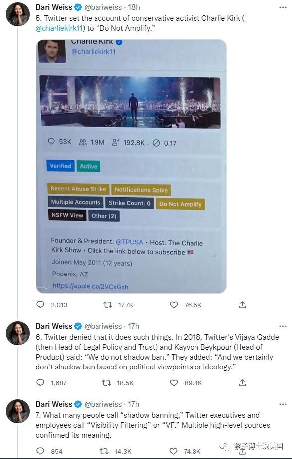 “(5). 推特给保守派活动人士Charlie Kirk的推特打上不推流的标签”