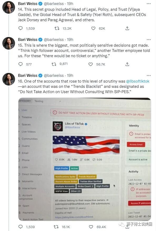 “(16). 被推特采取了SIP-PES操作的一个账户是,libs of tiktok, 它被放进了“热搜黑名单”以及打上“不要给他解封除非已经跟SIP-PES部门咨询过”