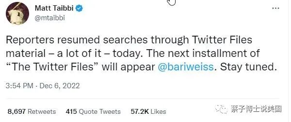 距离第一次Twitter Files 已经过去6天了,很多人很好奇为啥要过这么长时间才开始第二次爆料。Matt Taibbi 给出了解释: