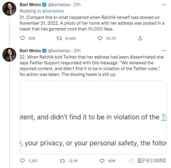 “(22). 当Raichik举报给推特她的家庭住址被传播,推特团队告诉她:这不违反我们的内部规定,不会采取任何行动。这个人肉的帖子现在还在。”