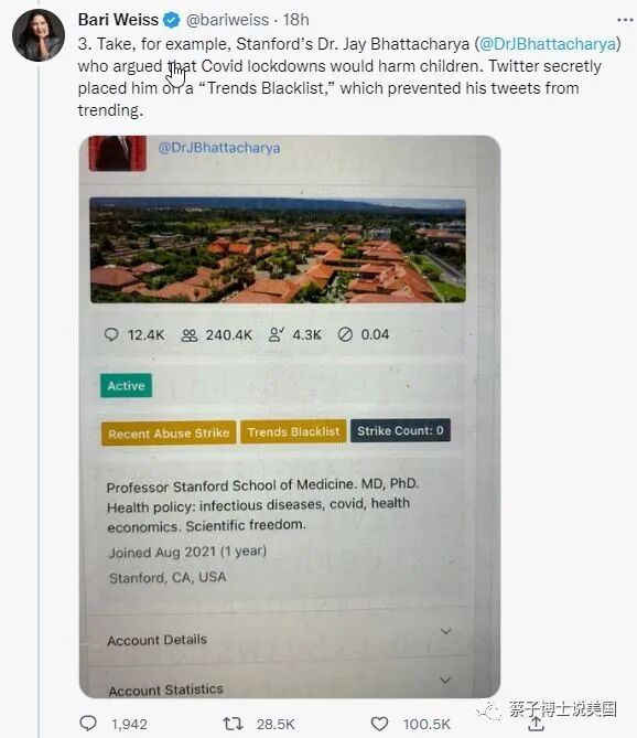“(3). 例如,斯坦福的医生Jay Bhattacharya 认为新冠封锁会伤害儿童的健康。推特秘密的把他放在了热搜黑名单里,这样他的推文永远不会火。”