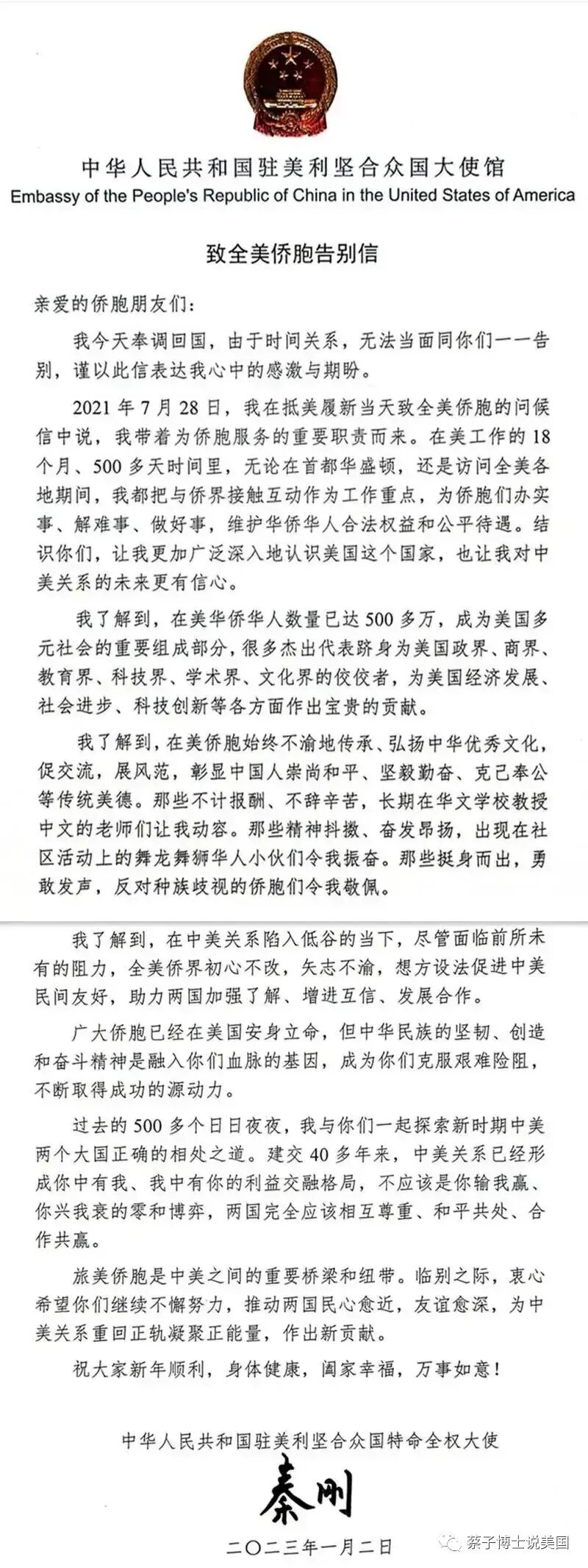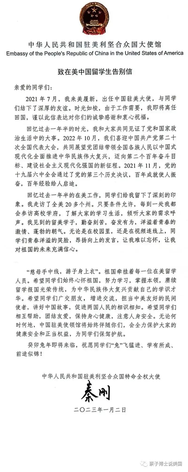 秦刚大使在离任之际,不忘寄语在美华侨和在美留学生。言语真切,格局大气,我作为曾经的在美留学生和现在的在美华侨,感同身受。