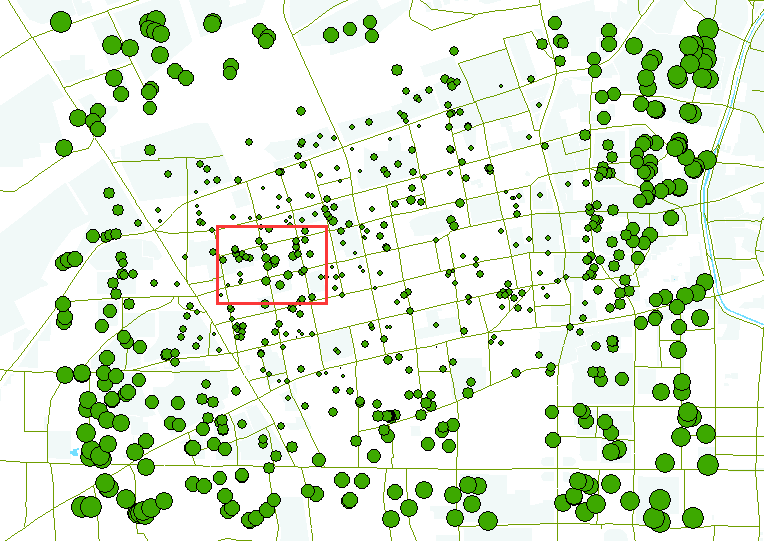 如上图标出的区域,意味着该区域内住宅区的公交站点服务性相对周边来说较差,是我们在做公交线网优化时需要重点研究的地方。