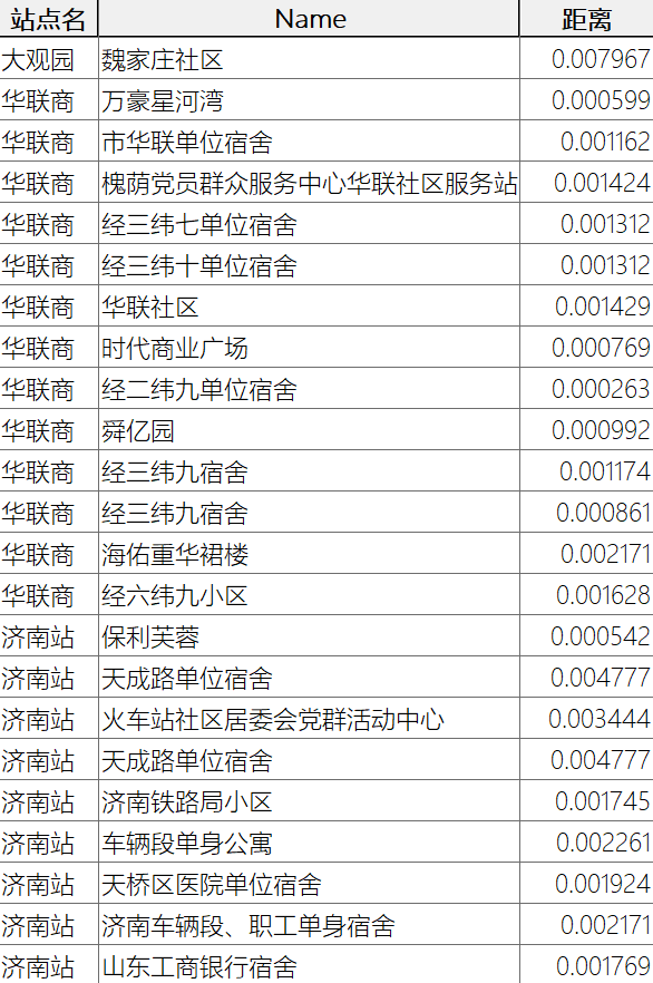 本文提供一种诊断公交站点分布的分析方法,该方法优势在于能够快速计算出大量的设施点与公交站点间的距离,节省分析工作的时间成本;而不足之处是本方法计算出的距离为直线距离,在实际居民出行中,影响更大的是路程距离,因此不适用于精确的距离测算分析。