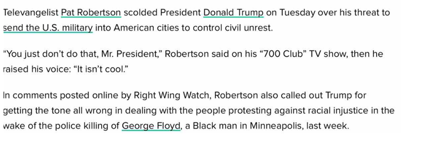 (部分)华人基督徒的恶习: 用“左派”扣帽子压制和霸凌 [被跪杀的美国黑人,生前竟是“福音勇士”:打砸抢烧的暴行,让他的死蒙羞。]其实我觉得强调Floyd是(浪子归家的)基督徒意义不大。无论他是基督徒还是无神论者穆斯林同性恋……,按照圣经和上帝的律法,滥杀生命也是罪,是侵犯上帝按照他自己的形象创造的生命。即使信主还是被杀只不过说明信主也不能保证在世界上不会遭遇不公(证明这个世界确实全然败坏被罪污染)。转一篇美南浸信会(美国最保守的宗派之一)的牧师和神学教授合写的文章:《福音和在你的城市里追求公义》及一篇我自己的旧文:《种族主义与基督福音 》 https://zhuanlan.zhihu.com/p/39205683? 【LF :昨天,家喻戶曉的福音派牧師Joel Osteen在休斯頓加入抗議隊伍,跟受害黑人的家屬一起遊行到市政廳。這兩天,一些福音派牧師陸續發聲,以期挽回因很多會眾狂熱支持川普而對教會聲譽的損害。】@LF 我不喜欢Osteen。估计也有一些弟兄姐妹会不认他是福音派牧师。但我确实知道有白人福音派牧师、领袖、神学家是支持甚至亲自参与和平抗议、为社会公义大声疾呼,呼吁改革,解决(或至少遏制吧)制度化的种族主义的。就连”宗教右翼”的老将Pat Roberson昨天都出来讲话,批评川普了。这跟反对暴力并不矛盾,跟“政治正确”也没什么关系。反对种族主义是维护福音,不是维护政治正确。我们教会的下一代告诉我,他们最被我们这代华人基督徒伤害的,是我们认定他们追求公义是被“白左”洗脑。你我父母叔叔阿姨跟他们处于同样的美国世俗文化里面,为什么你我一定没被洗脑,下一代就一定被洗脑?第一代华人基督徒真的应该反省,不要只是point fingers,一味批评指责下一代或把一切都归咎于世俗文化(虽然世俗文化无疑是堕落的)。有些人(葛福临)为了挺川也真是太拼了。这么多本来支持川普的白人保守福音派领袖,甚至宗教右翼代表人物,这次都公开表示川普拿圣经当道具(拿反了,而且是自由派翻译版本—不过这些我觉得并不重要,连铁杆川粉也不会相信川普是热爱读圣经的人)是不当甚至亵渎的。这些美国的牧长基督徒并非是自由派左派。昨天在另外的群里我转了那篇美国最保守(尤其是在种族方面)的美南浸信会的牧师和神学家写的关于基督徒与社会公义的文章,马上有华人基督徒(包括一名某基督教刊物核心作者)出来批评说这是自由派,左派。我觉得这是华人基督徒的一大恶习,不顾别人到底在讲什么(那篇文章纯粹就是在讲圣经,讲神学,没有半点提到对川普的看法),只要跟自己观点不同,就立马简单粗暴地贴个标签把人划分为“左派”“不信派”,我觉得这是非常不好的做法。(那位某刊作者有一次在外面说我是“白左基督徒”,结果被我看到,当面质疑她这么说有什么根据,她根本说不出来……)。此次批评川普的福音派和宗右领袖的另一个原因,跟批评他的前任和现任国防部长一样,是川普太轻易地动用军队来维稳,这跟这些右派人士的保守主义理念相违。这是宗教右翼领袖帕特罗伯逊的反应: 一些华人基督徒弟兄姐妹说他们支持川普投他的票是因为政策,他们并非“逢川必挺”,川普个人的言行他们也不认同。这样的“挺川”我比较能够理解和尊重。同样我也不是、不喜欢“逢川必反”。我如果反,也不过是因为其违背圣经或与我的“中偏右”价值观冲突(不是因为我是左派/自由派)。我有时候甚至为川普总统感觉不平。比如Floyd事件,川总确实是有出来公开讲“我们跟受害者家人站在一起”,谴责警察暴力的。也许你可以怀疑他是作秀、言不由衷,但至少这跟一些华人(特别是基督徒)拼命把问题归咎于黑人自己不好、犯罪率如何高,否认美国存在种族歧视的极端言论确实是不同的(这类极端言论本身是否就是种族主义,我留给诸君自己判断。换句话说,就是川普的支持者其实也抹了川普的黑。)这几天我也(亲眼)看见、(亲耳)听见美国的白人保守福音派牧长弟兄姐妹为美国、为教会、为自己祷告。他们更多地是为种族和解、和平,更为福音和主的教会祷告。其中很多的,是在上帝面前悔改、求圣灵光照自己也许隐而未现的罪,包括种族主义和对社会公义的冷漠。这跟一些拼命point fingers指责、攻击他人(白左、黑人)的华人基督徒(及葛福临这样不顾一切维护川普的少数美国宗教人士)形成非常鲜明的对比。前者是为了信仰和福音、见证,后者(在我看来)实质上还是在利用宗教搞政治,看重的是权力、选票及赢得争论。在很多华人基督徒群里后者似乎是占绝对优势,不少不同意见的弟兄姐妹噤若寒蝉不敢讲话,一讲话就一大堆人扑上来扣“左派”李伯儒帽子。这招非常管用,因为华人教会具有敬虔主义和基要主义传统(这本身并不一定不好,我自己也是偏向于这样的保守派),所以对很多弟兄姐妹来说左派就约等于撒旦,基督徒如果不恨之入骨像严冬一样残酷无情就是离经叛道跟魔鬼站一边。所以大家都害怕被戴上左派自由派的帽子(我也一样)。所以用这个压制甚至bully不同意见的基督徒是非常有用的。但我真的认为这是非常不敬虔、不正直、不顾合一的做法。我赞同不同意见的基督徒(在不是关乎基要真理的时候)互相尊重,彼此宽容,反对这种“属灵”高压。我相信前者绝不是被白左洗脑的自由派,他们也是在捍卫福音本身。正如洛桑信约(https:/
