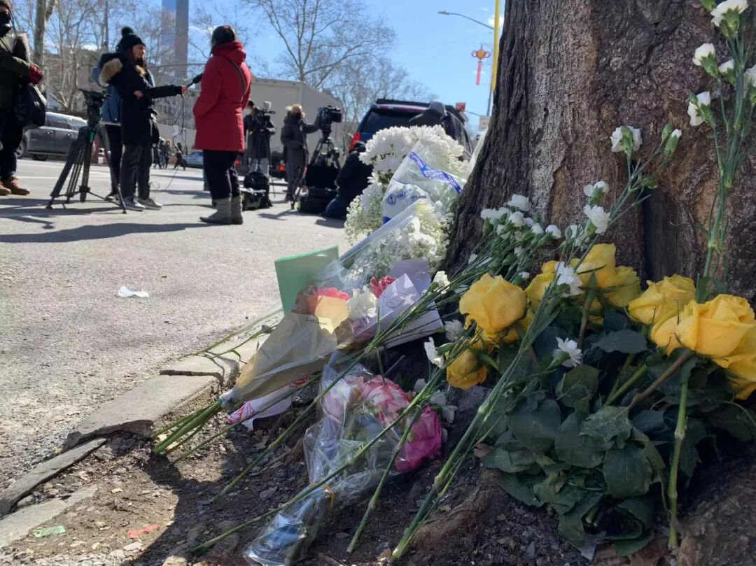 2月14日,信息正义记者再次回到李尤娜住过的公寓。距离唐人街血案刚刚过去30多个小时,企李士提街111号公寓楼的大门依然敞开着,门口围着警戒线和久久不肯散去的人群。很多人自发来到这里,将白色的菊花,黄色的玫瑰或者一张表示哀悼的卡片放在门前的那棵掉光了树叶的老树根上。
