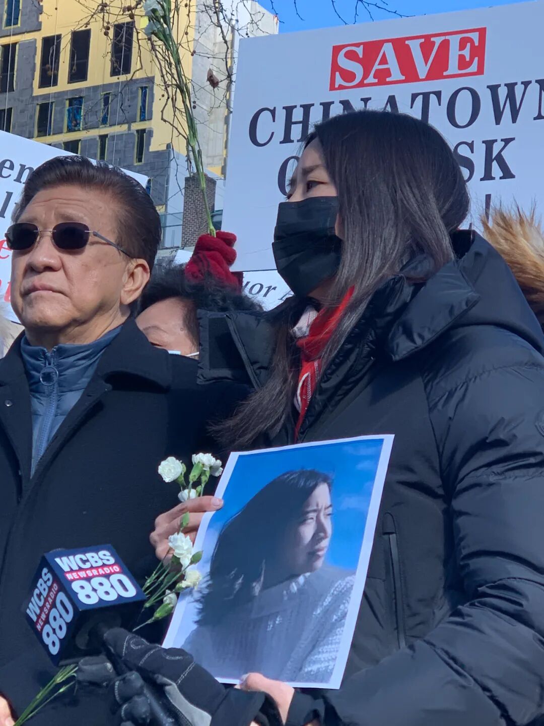 2月13日下午3点,纽约州众议员牛毓琳在唐人街血案大楼旁边的赫斯特(Hester)公园里组织了一场新闻发布会,另一名华裔纽约州参议员刘醇逸及多名议员、行政官员、非盈利组织代表及社区领袖也到了现场。