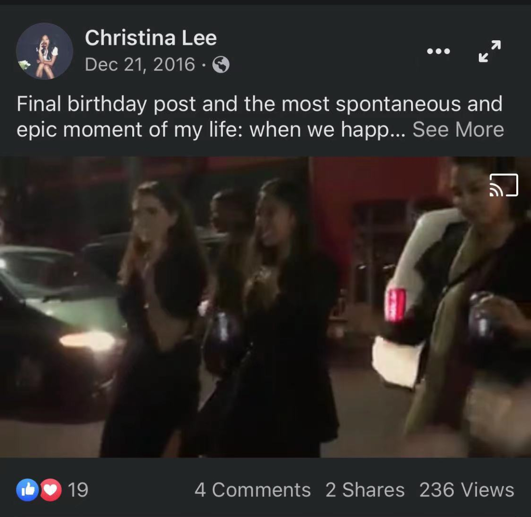 2016年12月19日,李尤娜30岁生日这一天,雷即兴为她弹唱了一首歌,“今天是你的生日,克里斯蒂娜,克里斯蒂娜,克里斯蒂娜,生日快乐,生日快乐……”雷和他背后的鼓手和键盘手唱和着,面对着李尤娜和她的一众朋友。